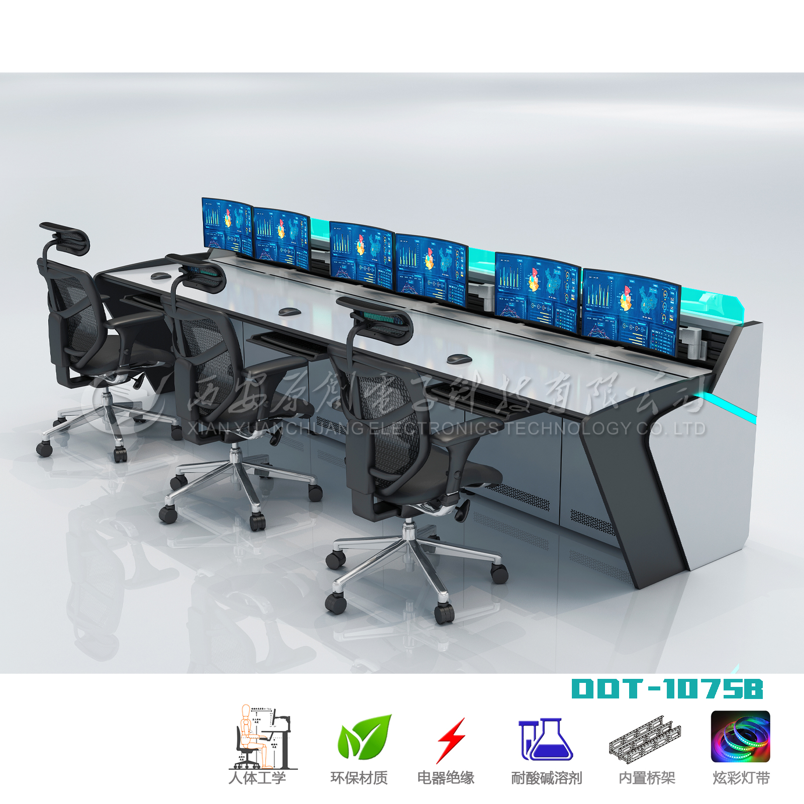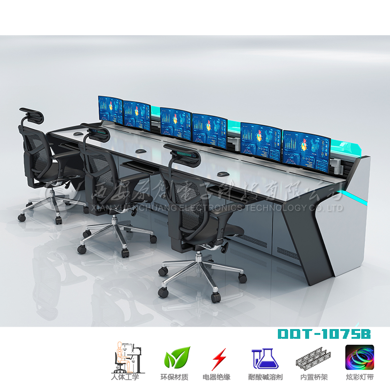 人體工學(xué)設(shè)計; 2. 鋼制結(jié)構(gòu),前后維護(hù)門; 3. 顯示器懸掛設(shè)計; 4. 暗藏式布線系統(tǒng),主機(jī)橫向擺放; 5. 配置維護(hù)照明燈; 6. 氣流交換散熱設(shè)計; 7. 配備顯示器安裝支架; 8. 配備RGB燈帶可選擇不同色彩氛圍; 9. 臺面具有防水、防霉、抗菌、耐酸堿腐蝕、耐磨、抗撞擊等功能; 10. 臺板需符合GB 18580-2017 甲醛釋放量限量標(biāo)準(zhǔn)要求; 11. 臺板需符合國標(biāo)GB 8624-2012 防火等級B1級標(biāo)準(zhǔn)要求; 本品為定制類產(chǎn)品,可依據(jù)客戶要求制作弧形等異形規(guī)格; |
